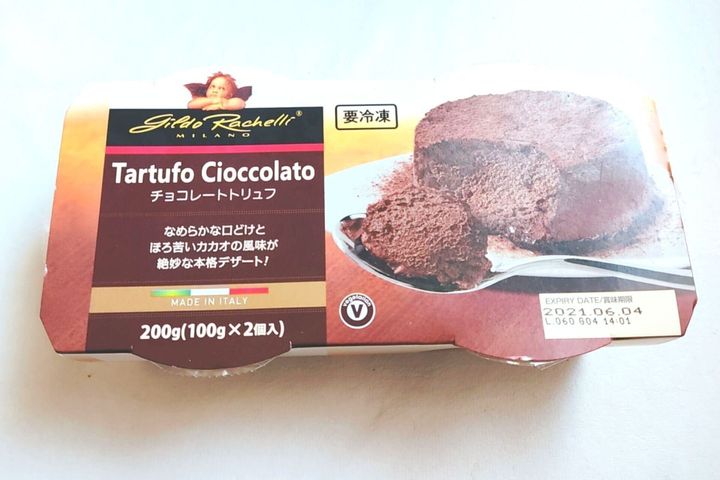 イタリア産のチョコレートトリュフは、2個入り・267円(税込)。1個あたり134円とコスパも抜群です。このイタリア産シリーズは、「ティラミス」「レモンケーキ」の3種類あり、SNSでも話題となった人気商品です。私も大好きなシリーズですが、なかなか店頭でお目にかかれず…やっと見つけて即買いしました。カカオの風味が絶妙のデザート!ということで期待が高まります。