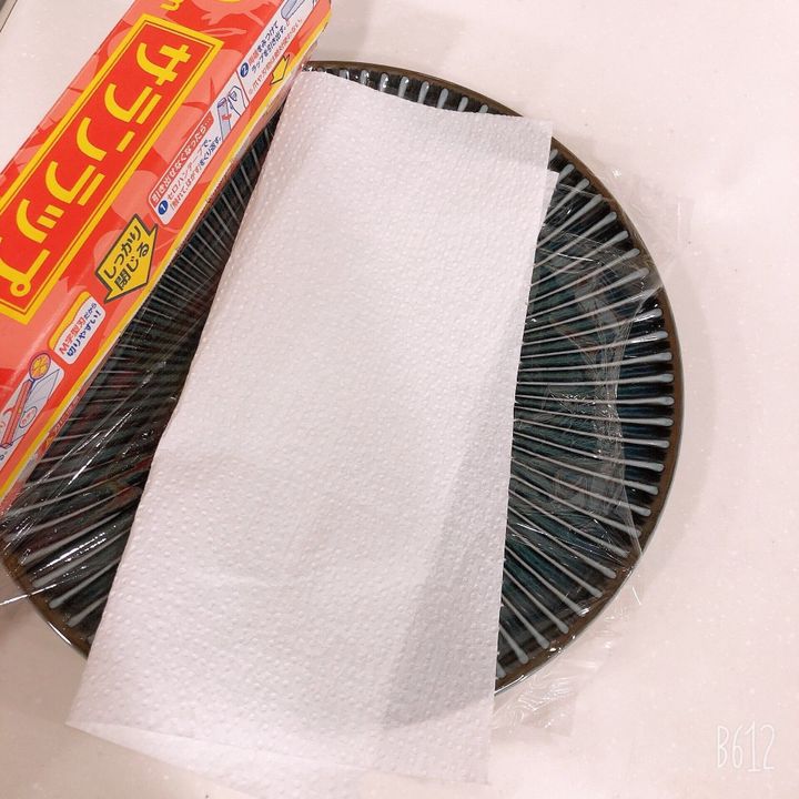 お皿に、ラップをひき、キッチンペーパーをひきます。