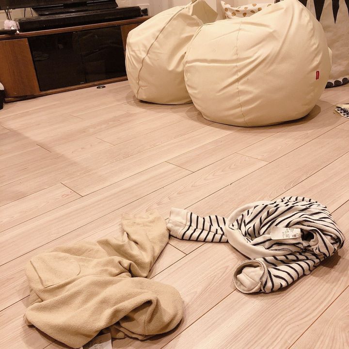 かごや置き家具を増やさないで、4年すごしてきましたが、自分でお着替えするようになった子ども達が、ぽいぽいとパジャマを脱ぎ捨てます~。