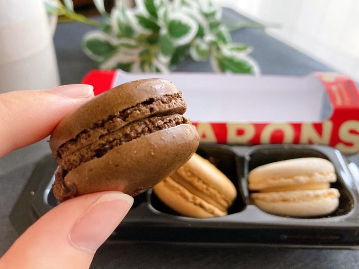 業務スーパーのマカロン(3種アソート)は税別298円。チョコレート・キャラメル・バニラの3種類が楽しめます。