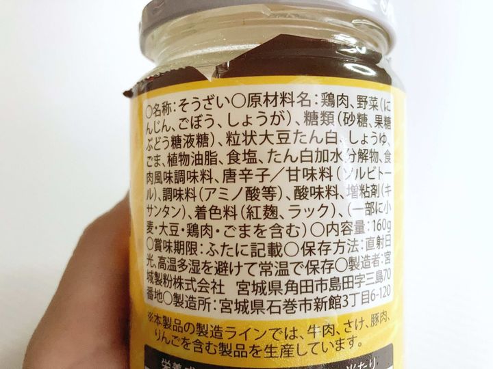 こちらの鶏そぼろは、瓶詰の商品で、160g入り税別148円です。製造元は、宮城製粉株式会社という様々な業スー商品を製造されている会社です。