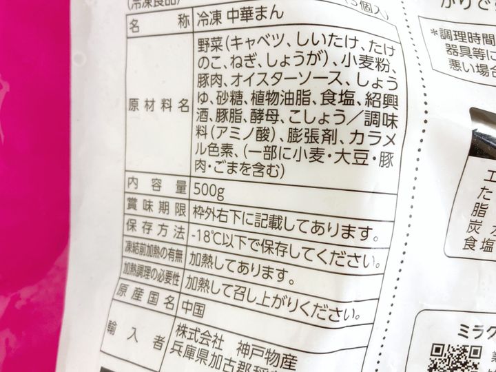 こちらの冷凍「中華まん」は、500g 5個入りで税別398円です。
