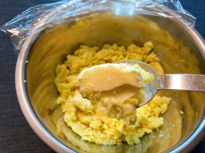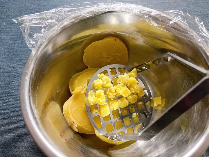 まずは、冷蔵庫で約3時間解凍したさつまいもの皮を取り、マッシャーなどでつぶします。