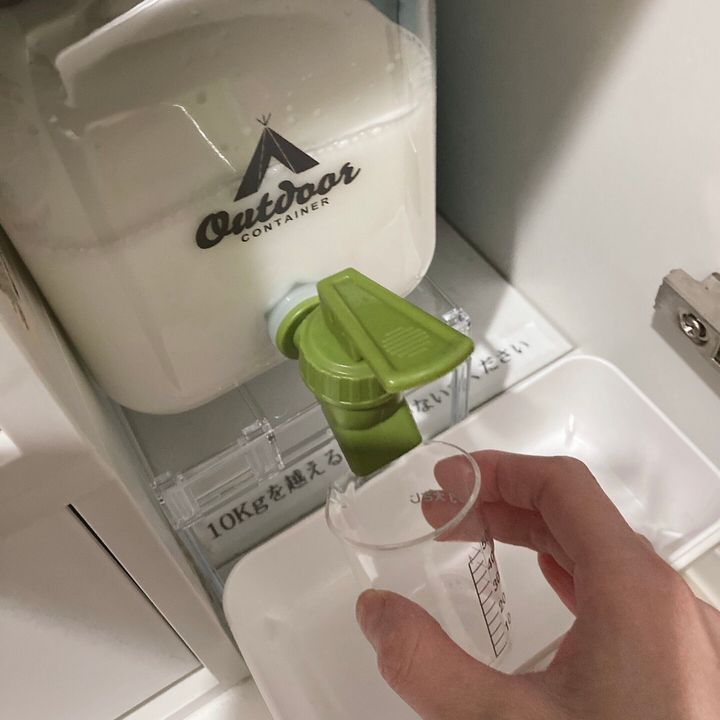 柔軟剤を詰め替え、レバーをあげると問題なく洗剤が出てくることが確認できました。
