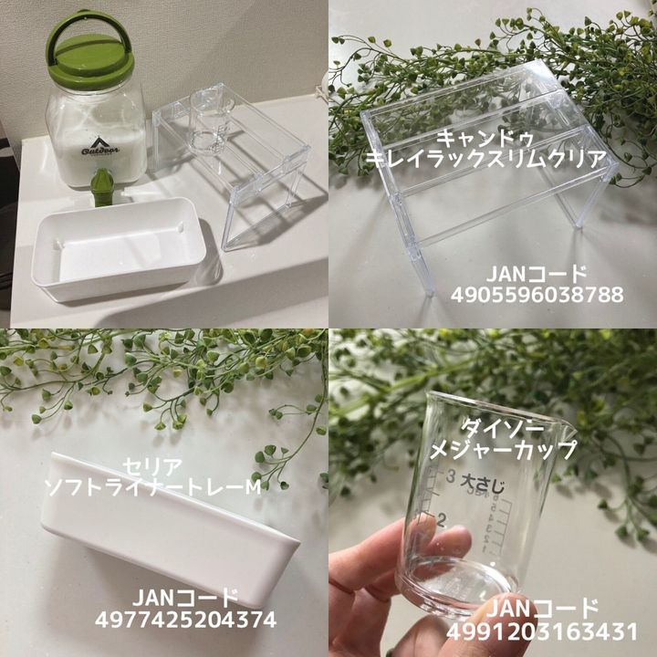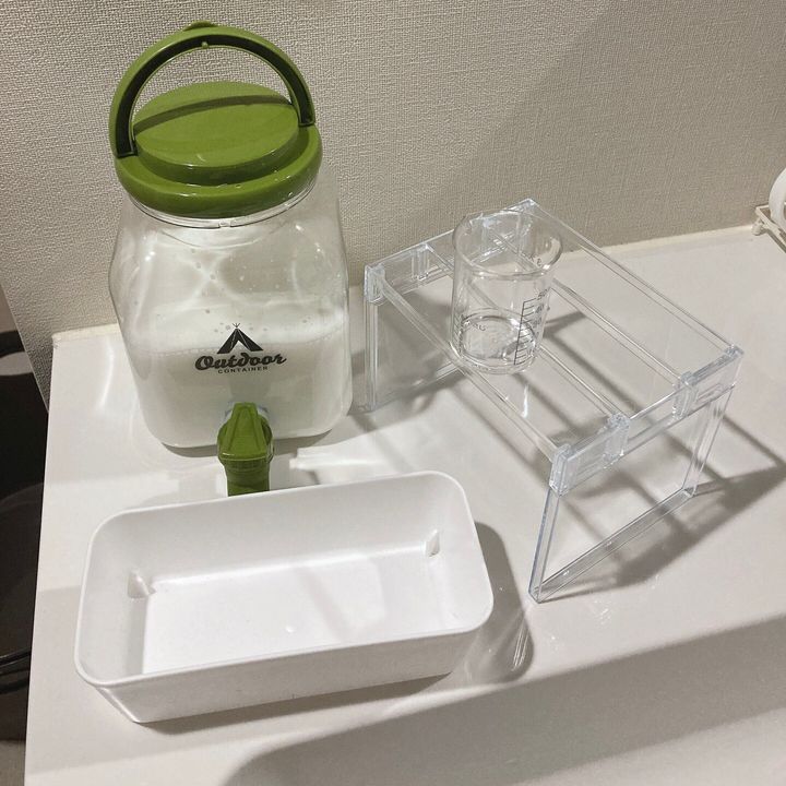 詰め替えた柔軟剤を注ぎやすく収納するために100円ショップで購入したアイテムを使います。