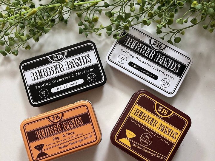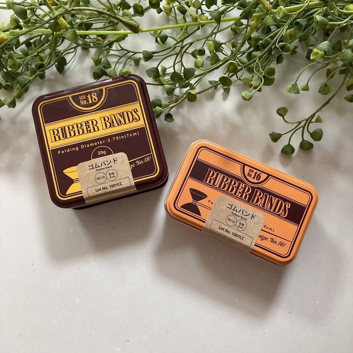 まさか中に輪ゴムが入っているとは思わないおしゃれなデザインの缶。たくさんあっても困らないのでついつい集めたくなる商品です。