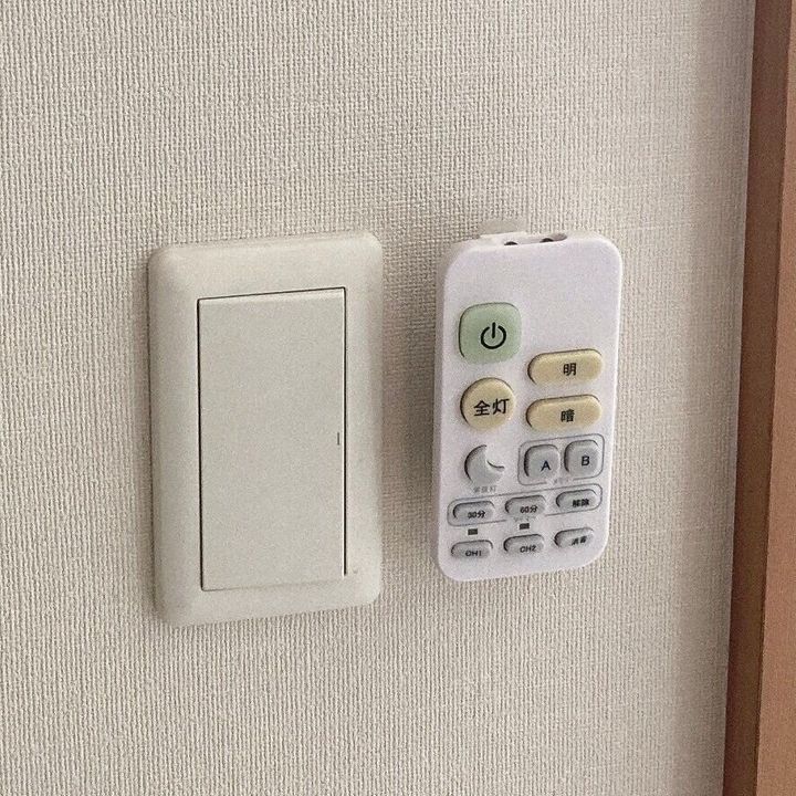 日中はスイッチを使うので出番が少ない照明のリモコン。壁掛け収納にすることでリモコンの迷子を防ぎ、スマートに収納できるのでおすすめです。