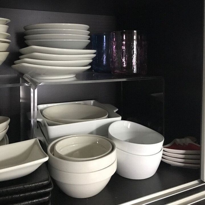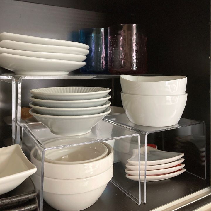 ミニサイズのディスプレイスタンドが食器棚の収納整理に大活躍!