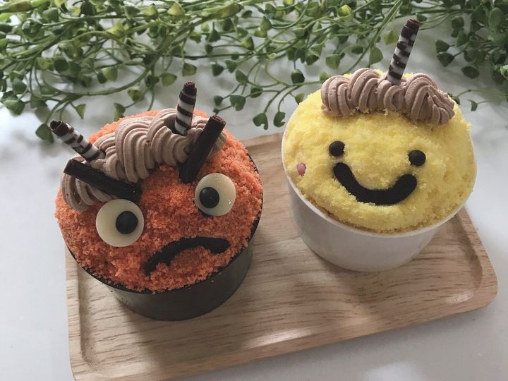 しっとりとしたふわふわのレモン風味のスポンジクラムでヨーグルトを包みチョコレートやチョコクリーム、そしてチョコソースで顔を飾った黄鬼をイメージとしたスイーツです。