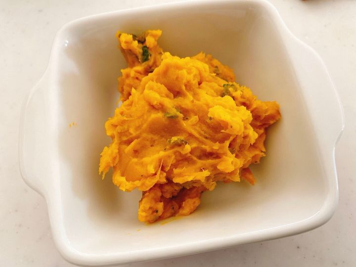 1.蒸しかぼちゃをボウルに移し、マッシャーやフォークでつぶす。