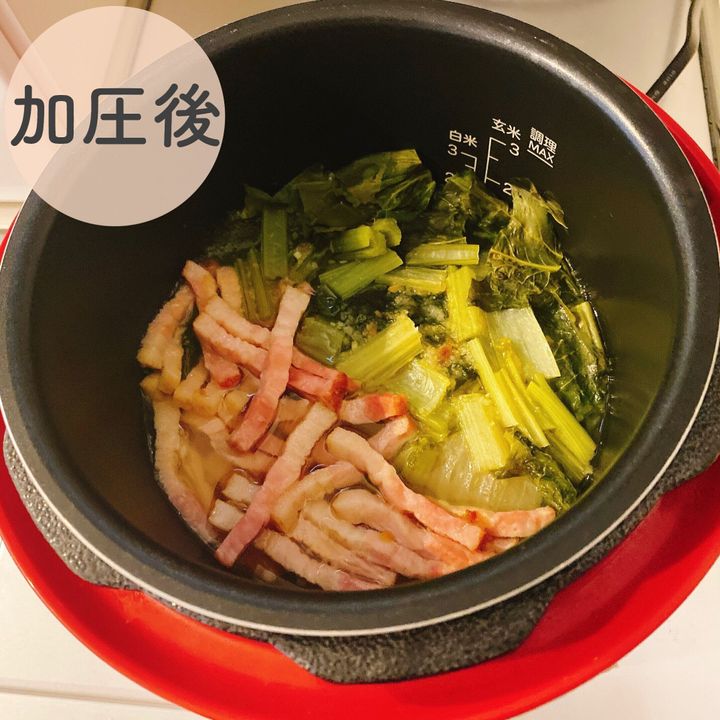 加圧時間1分でできる!小松菜とベーコンの豆乳スープ