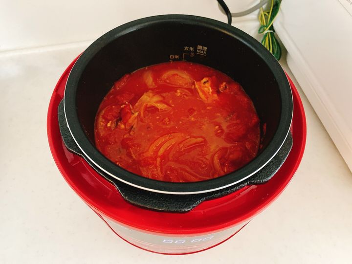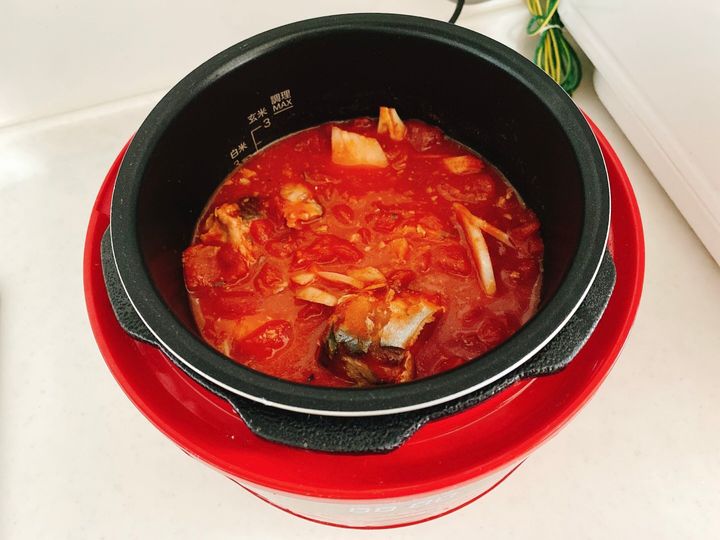 1.内なべに鯖の水煮缶(缶汁ごと)、カットトマト缶、薄切りにした玉ねぎ、水200mlを入れて軽く混ぜる。