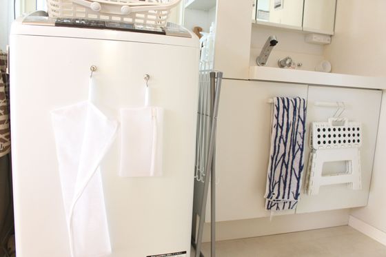 これまた100均アイテムの「マグネットフック」を使って、マスク用の洗濯ネットは洗濯機前に掛けて置いています。