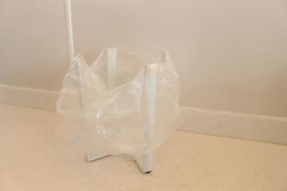 使う時だけ、このように広げ、ポリ袋を引っ掛けて料理中に出るゴミを捨てています。