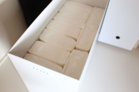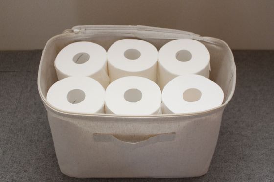 上の写真は「無印良品」のソフトボックス。2倍巻き×12ロールがピッタリ収まるサイズで蓋もついている為、とても管理しやすい収納アイテムです。