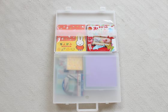 わが家では、このように、折り紙グッズの収納に使っている他、「裁縫道具入れ」としてもこちらのケースを活用しています。