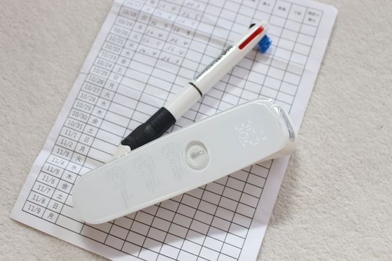 最初は、脇に挟むタイプの体温計を使用していましたが、朝は時間との勝負!という事で、一秒で測定できるこちらの体温計に変更しました。
