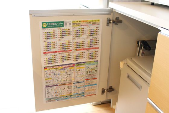 このゴミ箱収納の扉を開いた部分がカレンダーの大きさにピッタリでした!