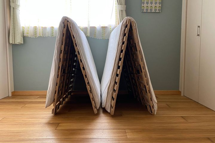 狭小住宅の我が家では、フローリングに二つ折りすのこベッドを置いて、お布団を使用していることもあり、普段は、すのこベッドを折り畳み、室内で布団干しをしています。