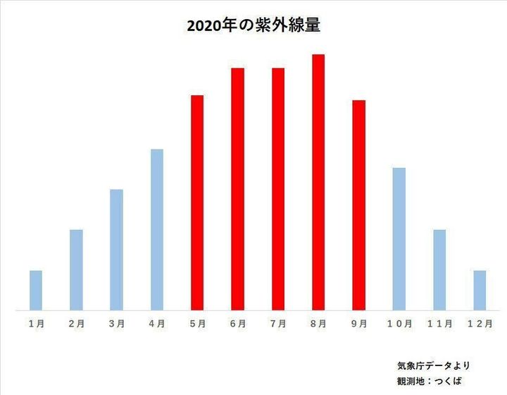 さらに、紫外線量も5月から8月にかけて上昇していきます。