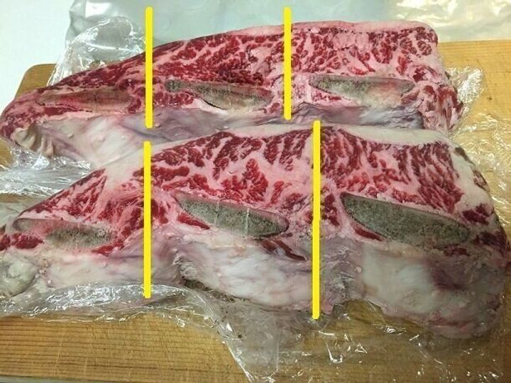 まず、お肉の中に大きな骨が並んでいるので骨と骨の間に包丁を入れてカットします。