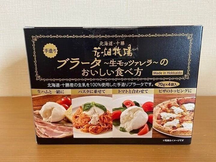 生モッツァレラ「ブラータ」4個入りです。花畑牧場のものに限らずブラータ自体まだ食べたことがなかったので興味津々。