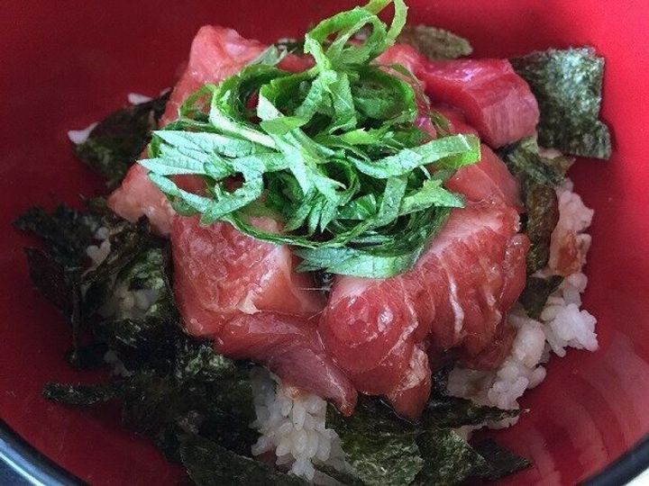 醤油・みりん・酒で作ったタレに漬けてほかほかご飯の上に。
