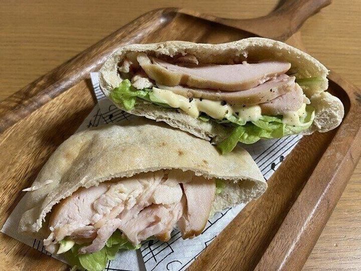 写真はピタパンにレタスと一緒にたっぷりスモークチキンスライスを挟んでみました。