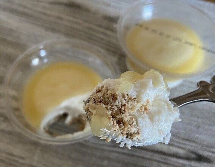 カップの中で3層になっていて、下からビスケット生地、チーズケーキ、上にはたっぷりのレモンソース。