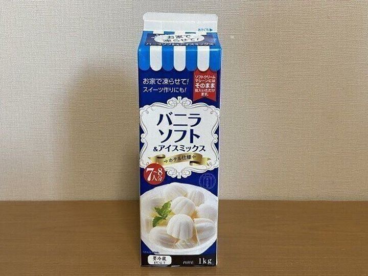 業務スーパーの名物商品、牛乳パックスイーツの並びに登場していた「バニラソフト&アイスミックス」購入時価格:275円(税抜)は、おうちで凍らせて作るアイスの素です。