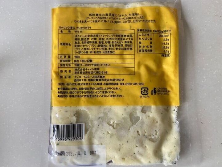 北海道産の馬鈴薯を使った、「ガーリック香る アリオリポテト」(購入時:199円税込)はチーズや乳製品が並ぶ冷蔵コーナーで販売されていました。