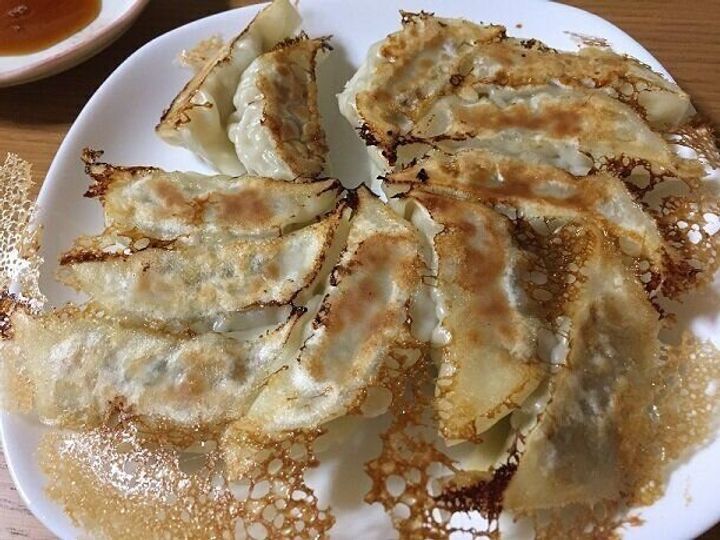 焼き餃子。ニラとにんにくがしっかり効いたパンチのある味わいで、お酒のおつまみにも