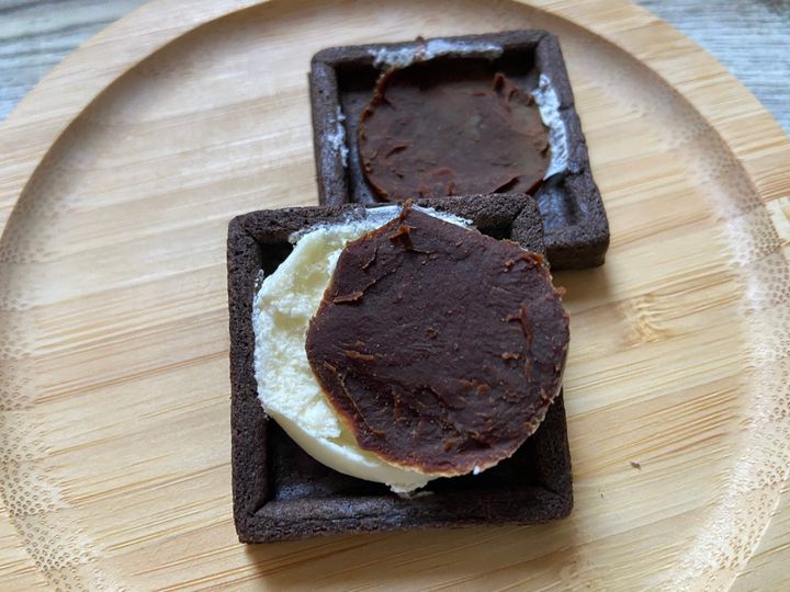 ダークな色のクッキー生地にサンドされているのは2種類のコロンビア産チョコレートを使用しラム酒で香りづけされたチョコレートキャラメルと、、なめらかなバタークリーム。