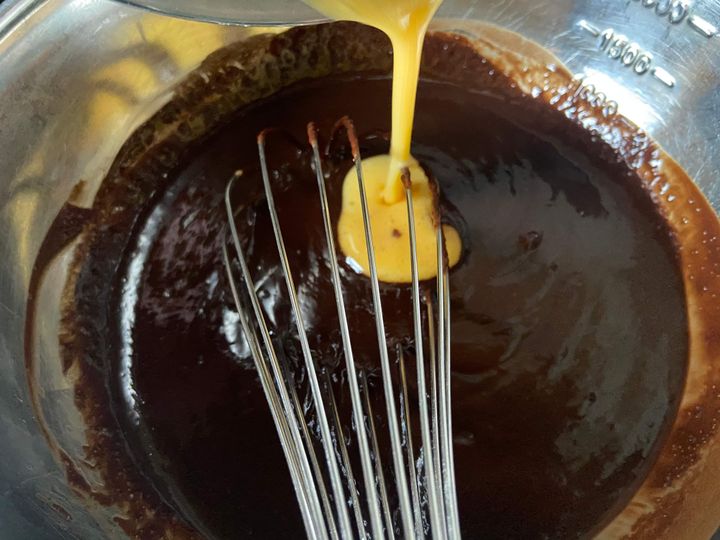 溶きほぐした卵を少しずつ加えながらよく混ぜます。グラニュー糖が溶けてチョコレートにつやが出てきたら生地の完成!作業中は部屋中がカカオの香りに満たされて、とっても癒されます!
