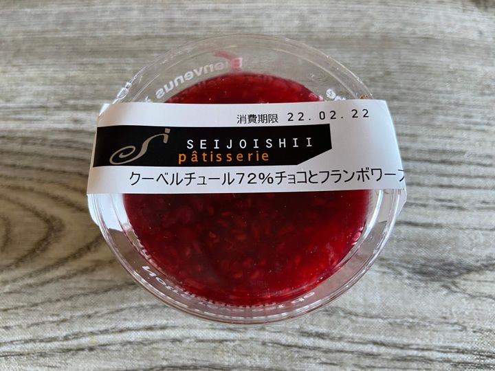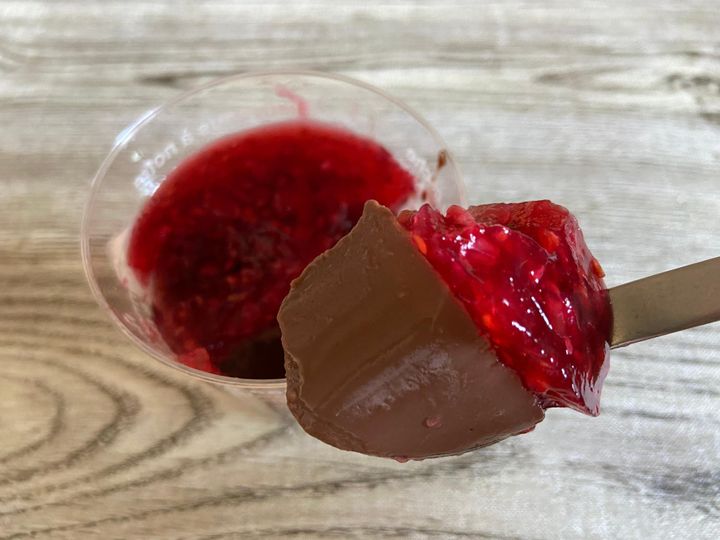 成城石井の自家製商品で、クーベルチュールチョコレートを使用したなめらかで濃厚なプリンに、甘酸っぱいフランボワーズジュレがアクセント、とのこと。チョコとベリーの組み合わせが大好きな筆者は即カゴに入れました!