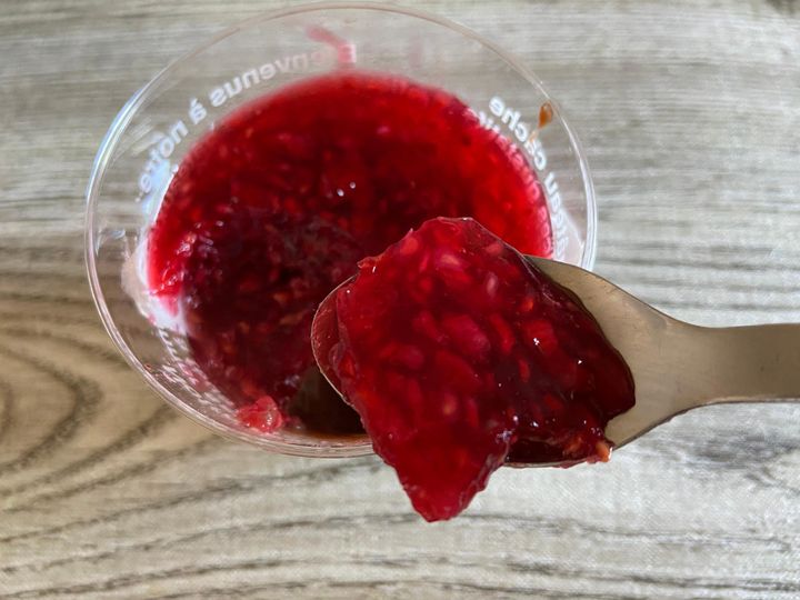 フタを開けると鮮やかな赤いジュレが!フランボワーズの種のつぶつぶも見えます。甘酸っぱいいい香りが広がって、期待も高まります!