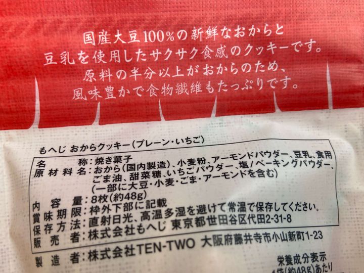 以前一度同じおからクッキーを購入したことがありますが、その時はプレーン・かぼちゃ・紫いもの3種のフレーバーでしたが、今回新登場したのはプレーン・いちごの2種のフレーバー。お豆腐屋さんの店先のようなのれんのデザインがとってもおしゃれですね。