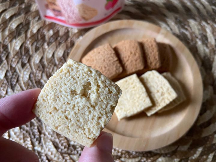 次はいちご味です。いちごパウダーが練り込まれいてほんのり甘酸っぱい香りがします。食感はプレーンと同じくザクザク系。おからの風味もしっかりあるし、いちごの存在感もあります。噛めば噛むほどやさしい甘さが出てきて、とってもおいしいです。