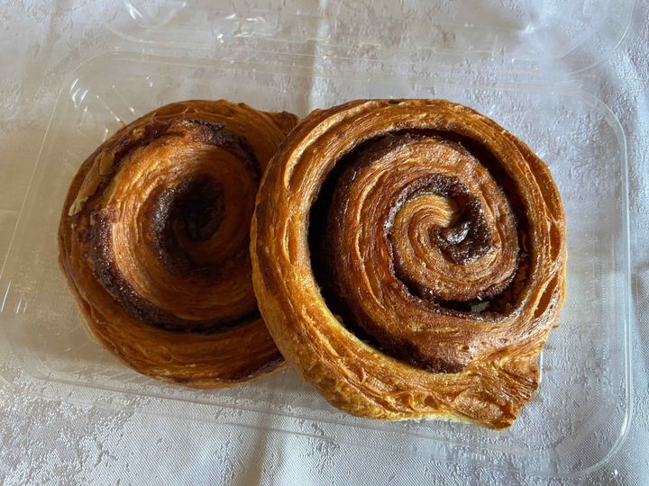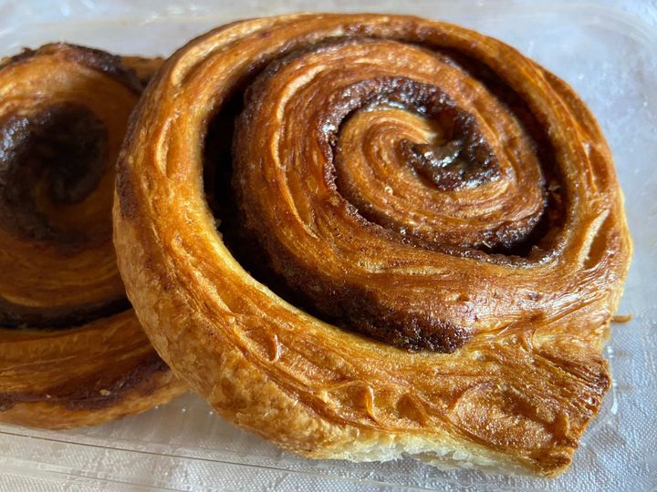 デニッシュのようなソフトなパン生地にシナモンフィリングが巻き込んであり、平たく大きめのロール状になっています。