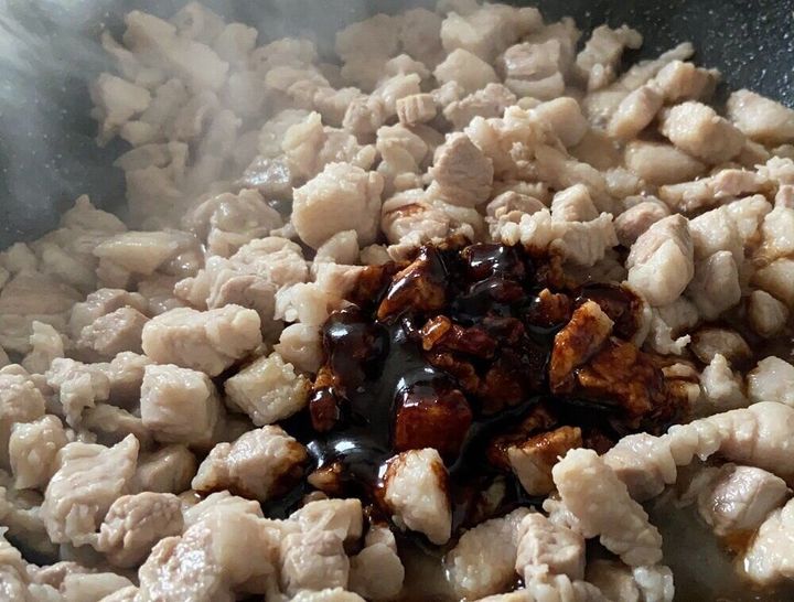 豚バラ肉ブロックを角切りにしてごま油で炒め、ルーロ飯の素と水を入れて煮込むだけ!豚ひき肉を使えばもっと簡単に作ることができますよ。