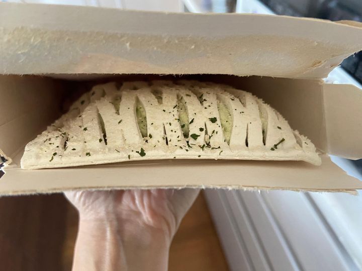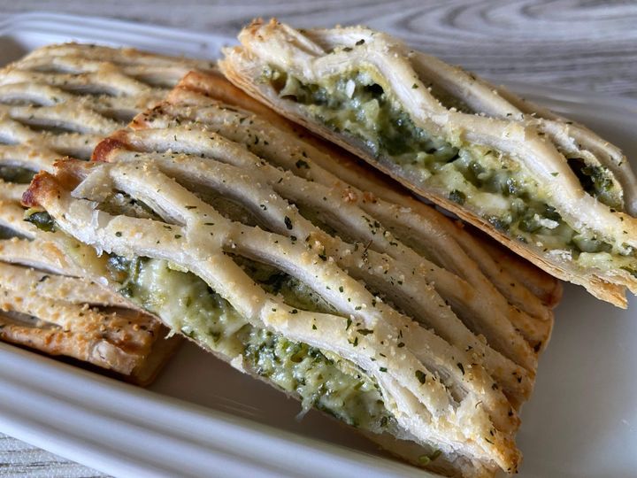 カットしてみるとチェダーチーズとほうれん草のフィリングがたっぷり入っていて、オーブンで焼いたのでアツアツでとろりとしています。