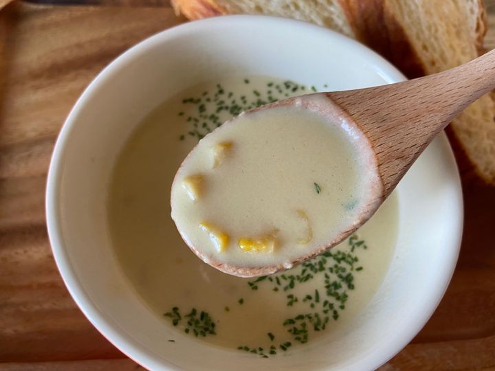 丸鶏を炊きだしたスープに24ヶ月熟成のパルミジャーノ・レジャーノを使用しているとのことで、コーンの甘さだけでなくチーズの豊かな風味や旨みがぎゅっと詰まって奥深さが感じられます。甘さはほんのりなので、大人向けのコーンポタージュという印象!