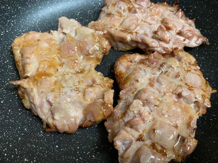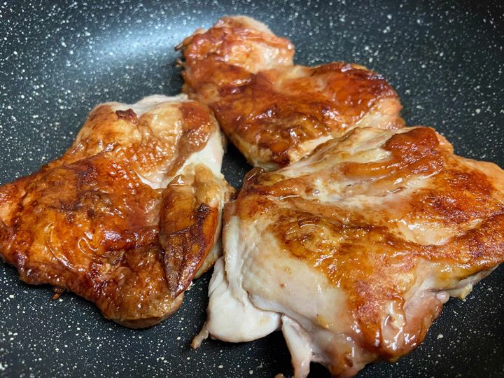 フライパンに油をひかず、皮目からしっかり焼きます。
