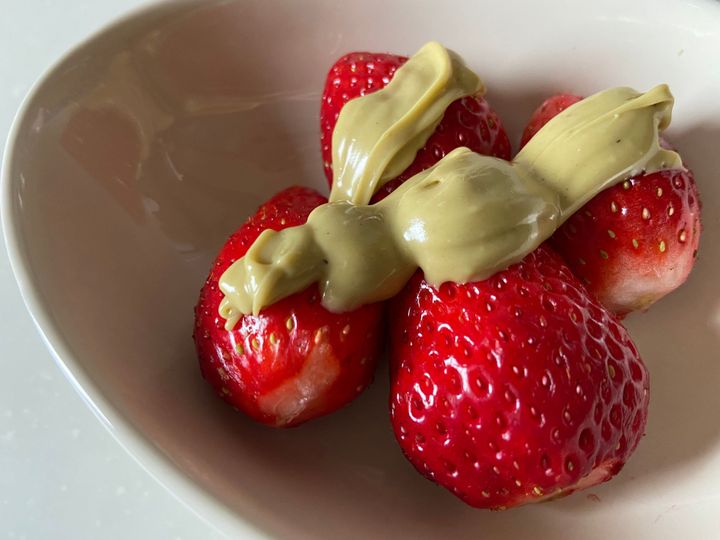 ピスタチオとベリーは相性がいいとのことで、フレッシュな苺にたっぷりかけてみました。ピスタチオスプレッドのベースがホワイトチョコのような濃厚な味わいなので、苺ミルクのような子どもも大好きな味に!鼻からぬけるピスタチオの風味がたまりません。