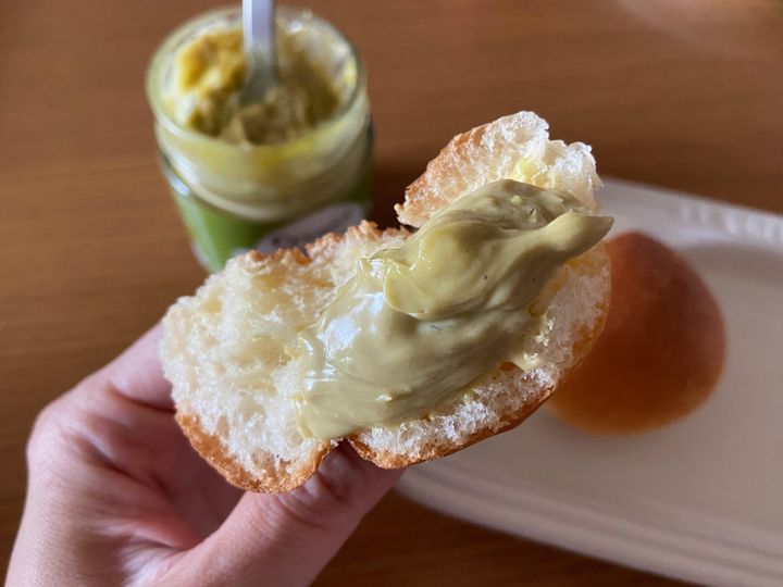 最高においしい!ホワイトチョコのようなコクのある甘さにピスタチオのナッティな香りと風味を感じられるピスタチオスプレッド、いくらでもパンが食べられちゃいそう!