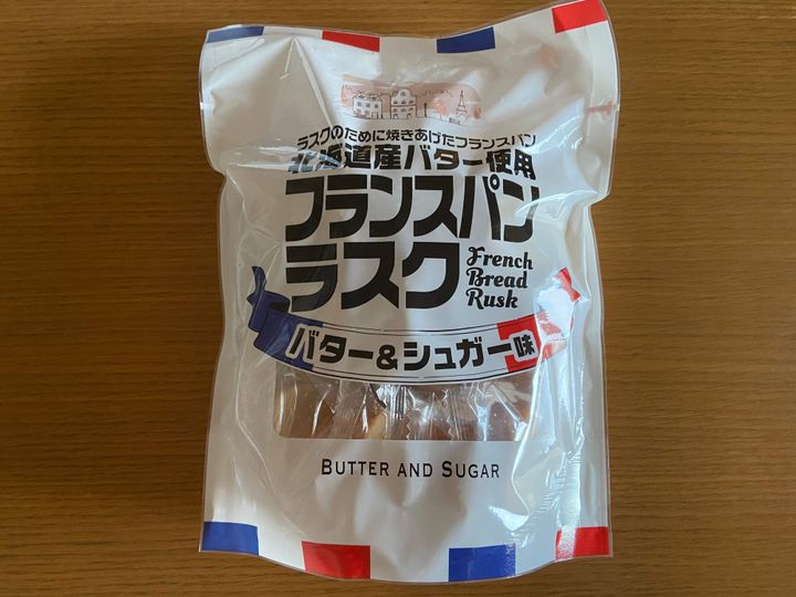 ラスクといえば余って固くなったフランスパンをおいしく食べるために作られたもの、のイメージが強かったのですがこちらはなんと、ラスクのために焼き上げられたフランスパンを使っているとのこと。そこに北海道産のバターと砂糖を合わせて作られています。