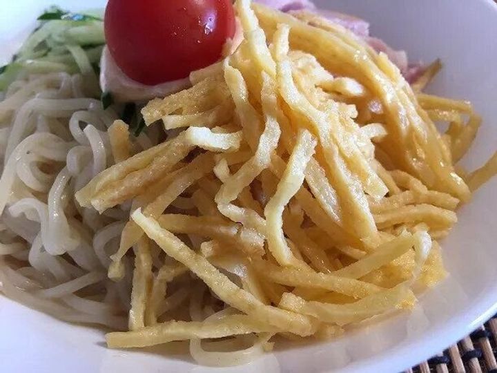 自然解凍で食べられるとのことで、解凍後に冷やし中華にトッピングしてみたのですが、食感がスカスカで油揚げのような食感。錦糸玉子は自分で作ろうと思った商品でした。