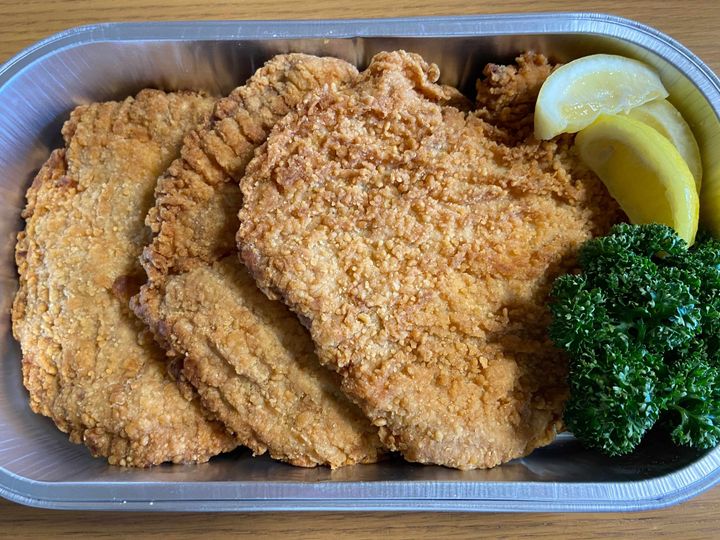 鶏肉をたたいて伸ばして揚げた大きなジーパイが、1パックに3枚入り。パセリとレモン、そのまま食べられるようにペーパーが入っていました。オーブンかオーブントースターで表面を焼いて、お好みでレモンをかけてお召し上がりくださいとの表記が。
