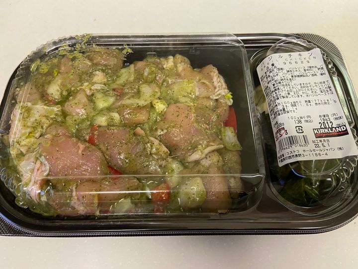 国産の鶏肉がたっぷりのバジルソースで味付けされている、焼くだけ簡単調理の商品で100g当たり138円と手頃な価格もうれしい!内容量は筆者が購入したものは1458gでした。