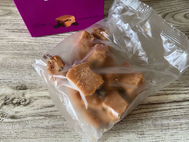 箱の中にはファッジがたくさん入った袋が。個包装ではなく1袋にすべて入っています。袋を開封してみると、ラムレーズンのいい香りが広がります。
